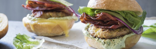 Chicken & bacon burgers with basil-avocado mayo