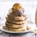 Double caramel hotcakes with butterscotch sauce Makes 10–15 hotcakes Prep time: 10 minutes plus resting time Cooking time: 20 minutes Ingredients 2 tbsp fresh lemon juice 2 cups Lewis Road Creamery Double Caramel Milk 2 ¼ cups plain flour 2 tsp baking powder 1 tsp baking soda pinch sa